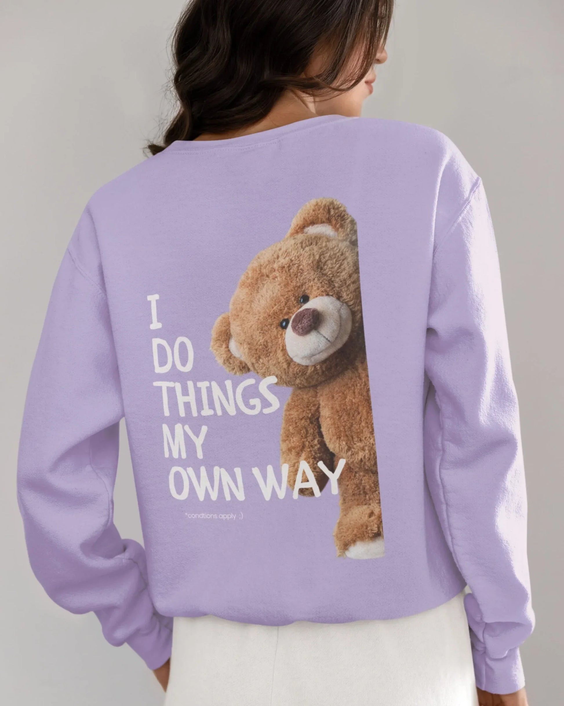 Stay cozy and express your unique personality with this adorable and empowering sweatshirt! Featuring a cute teddy bear and the bold statement "I Do Things My Own Way" on the back, this lavender sweatshirt is both playful and stylish. The fun addition of "conditions apply ;)" adds a cheeky touch to the design. Perfect for casual days when comfort and self-expression are key.