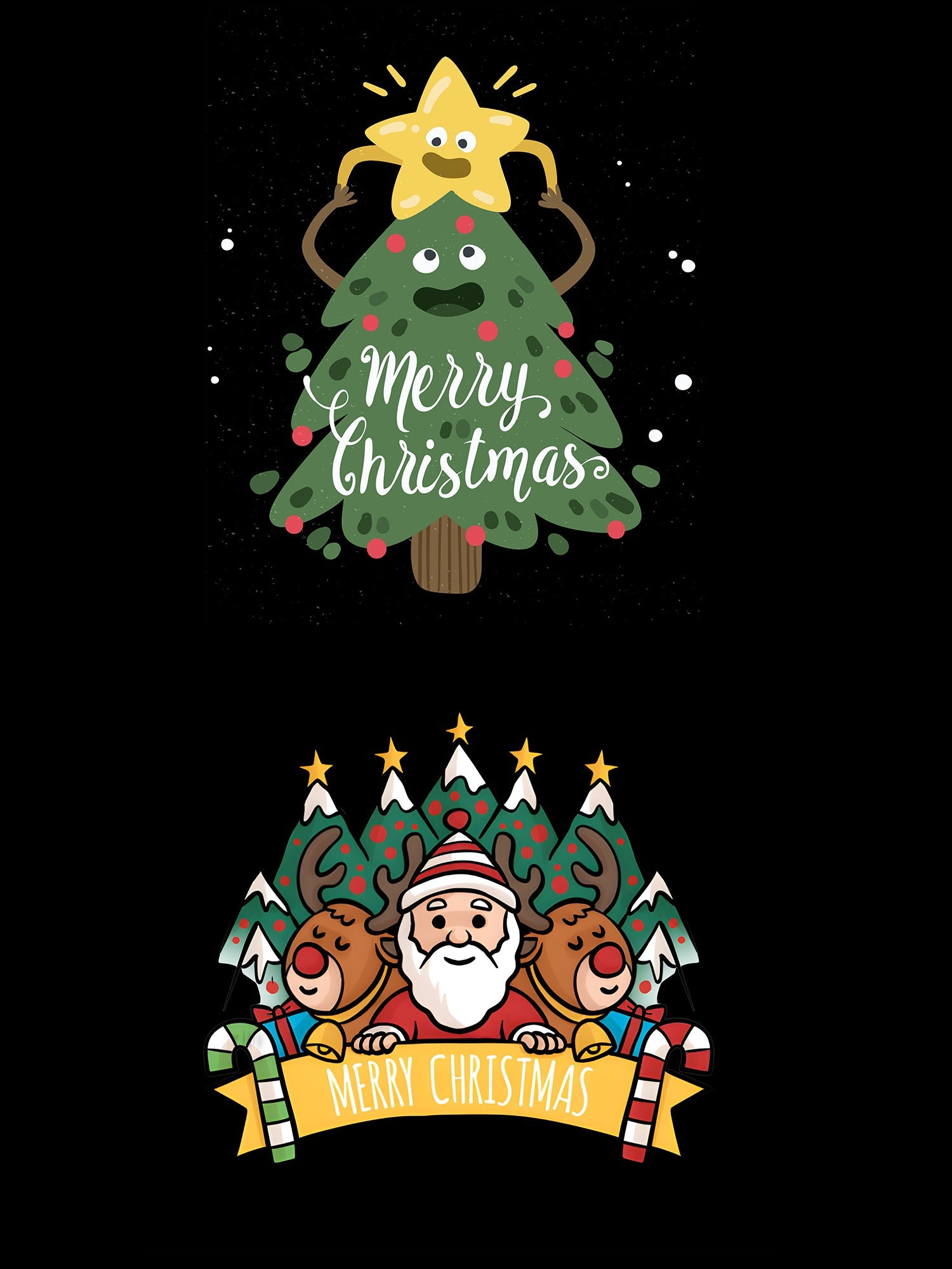 Cute Santa, reindeer & festive tree graphic on back + Merry Christmas print on front